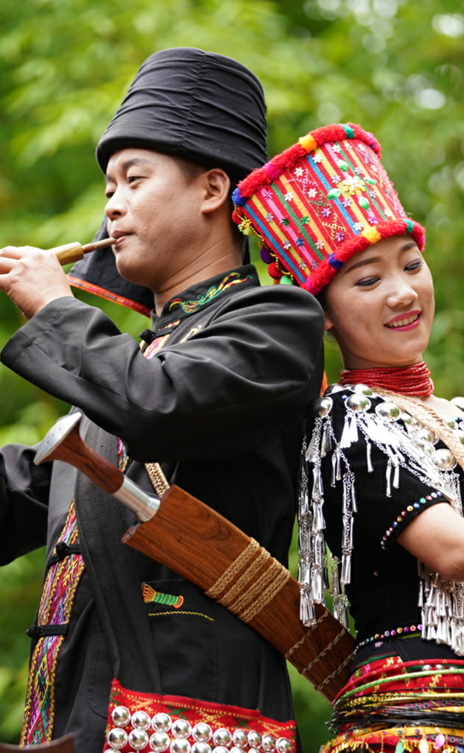 拉祜族人口約41萬(wàn),主要聚居在思茅、臨滄境內(nèi)的瀾滄江沿岸地區(qū)。拉祜族寨與基諾族寨緊緊毗連,寨內(nèi)建有拉祜族茅草房、大公房、教堂、牛棚以及葫蘆廣場(chǎng)。位于拉祜族寨中心位置的葫蘆廣場(chǎng)形似一只碩大的葫蘆平面,核心有一組石雕葫蘆。傳說(shuō)拉祜族的祖先誕生于葫蘆中,因此葫蘆廣場(chǎng)表現(xiàn)了拉祜族的祖先崇拜觀念。漫步拉祜族寨,葫蘆笙悠揚(yáng)婉轉(zhuǎn)、口弦聲余音繞梁,表現(xiàn)拉祜族勞動(dòng)場(chǎng)面的“豐收擺舞”充滿(mǎn)歡騰和激情,展示了拉祜族的民間...